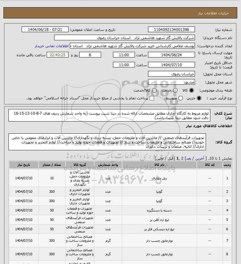 نام دستگاه خریدار:شرکت پالایش گاز شهید هاشمی نژاد استان خراسان رضوی
