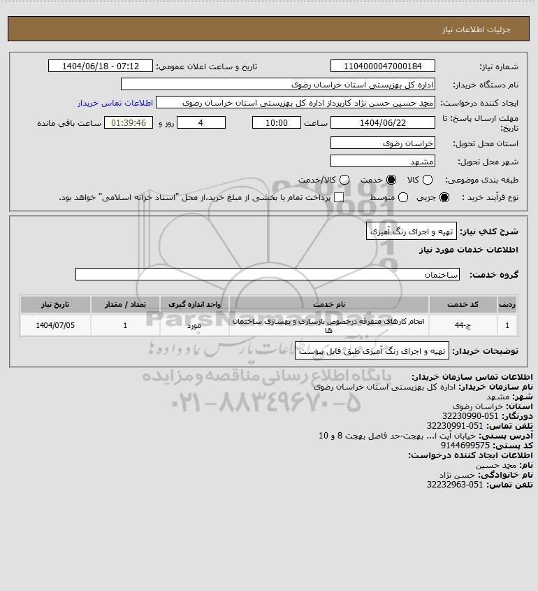 شرح کلی نیاز: تهیه و اجرای رنگ آمیزی