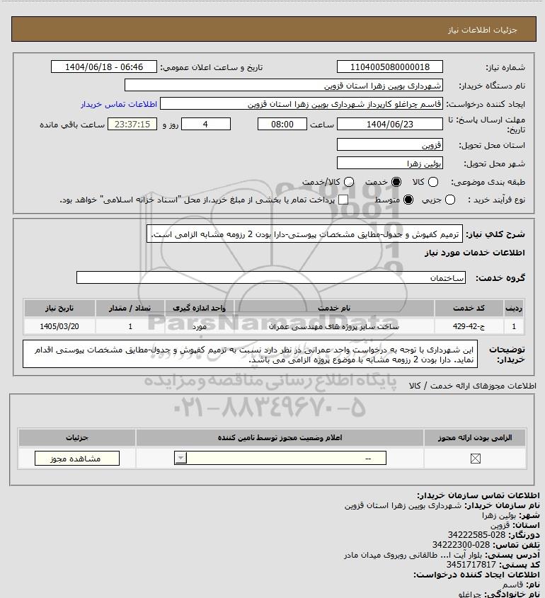 شرح کلی نیاز: ترمیم کفپوش و جدول-مطایق مشخصات پیوستی-دارا بودن 2 رزومه مشابه الزامی است.