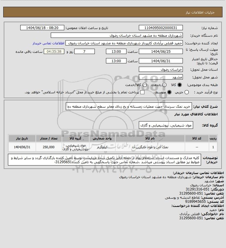 شرح کلی نیاز: خرید نمک سرندی جهت عملیات زمستانه و یخ زدای معابر سطح شهرداری منطقه ده