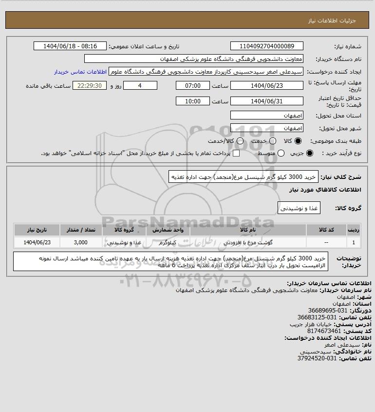 شرح کلی نیاز: خرید 3000 کیلو گرم شینسل مرغ(منجمد) جهت اداره تغذیه