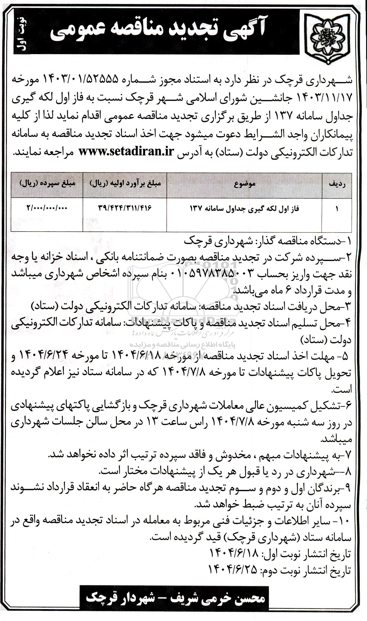 شهرداری قرچک در نظر دارد به استناد مجوز 1403/1/52555 مورخه 1403/11/17 جانشین شورای اسلامی شهر قرچک نسبت به فاز اول لکه گیری جداول و سامانه 137 از طریق برگزاری مناقصه عمومی اقدام لذا از کلیه پیمانکاران واجد الشرایط دعوت میشود جهت اخذ اسناد مناقصه به سامانه تدارکات الکترونیکی دولت (ستاد) به آدرس ستاد ایران مراجعه نمایند.