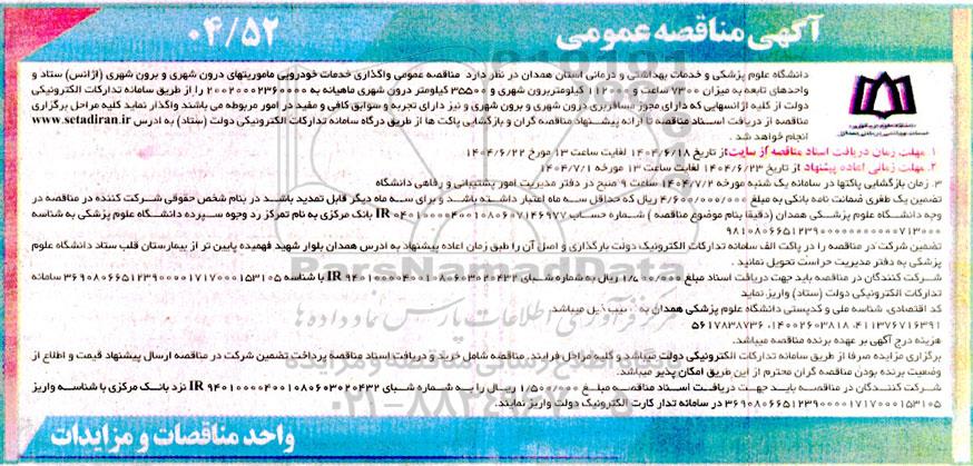 دانشگاه علوم پزشکی و خدمات بهداشتی و درمانی استان همدان در نظر دارد مناقصه عمومی واگذاری خدمات خودرویی ماموریتهای درون شهری و برون شهری (آژانس) ستاد و واحدهای تابعه به میزان 7300 ساعت و 112000 کیلومتر برون شهری و 35500 کیلومتر درون شهری ماهیانه به 20020002360000 را از طریق سامانه تدارکات الکترونیکی دولت از کلیه اژانسهایی که دارای مجوز مسافربری درون شهری و برون شهری و نیز دارای تجربه و سوابق کافی و مفید در امور مربوطه می باشند واگذار نماید. کلیه مراحل برگزاری مناقصه از دریافت اسناد مناقصه تا ارائه پیشنهاد مناقصه گران و بازگشایی پاکتها از طریق درگاه سامانه تدارکات الکترونیکی دولت (ستاد) ایران انجام خواهد شد.