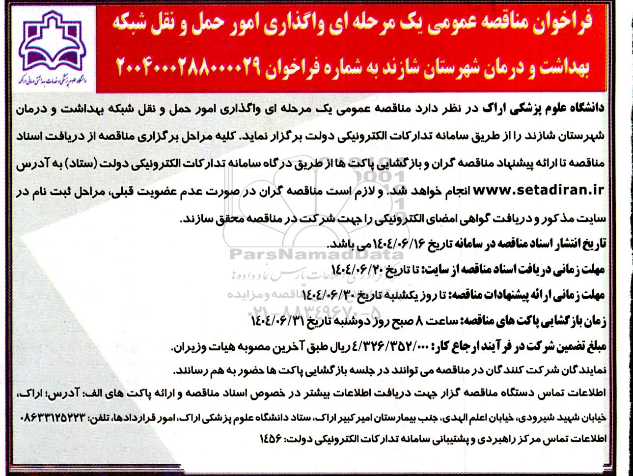 واگذاری امور حمل و نقل شبکه بهداشت و درمان شهرستان شازند به شماره فراخوان 2004000288000029