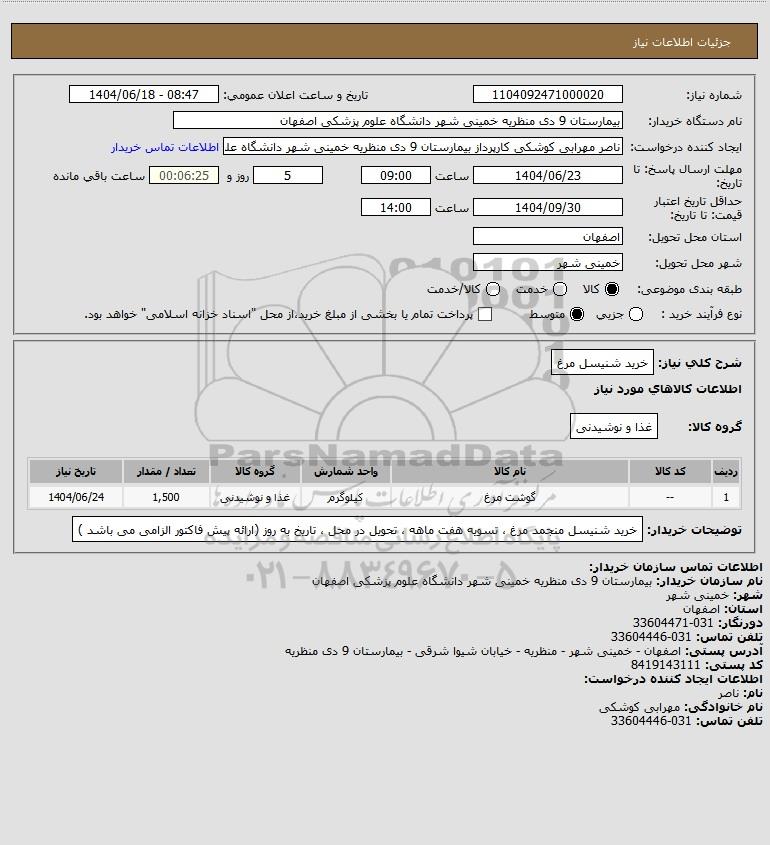 استعلام بها و موضوع استعلام استعلام خرید شنیسل مرغ به اطلاع کلیه شرکتها و افراد متخصص واجد شرایط میرساند، آگهی گذار در نظر دارد از طریق استعلام بها، نسبت به انتخاب و دریافت پیشنهادات اقدام نماید. این استعلام با کد آگهی ثبت شده در سامانه خبرگزاری پارس نماد : 9523645 منتشر شده است. مشخصات استعلام : تاریخ شروع استعلام: 1404/06/18 آخرین مهلت ارسال پیشنهاد قیمت : 1404/06/23 و محل اجرای پروژه : استان اصفهان میباشد. استعلام قیمت مورد درخواست : استعلام خرید شنیسل مرغ با دستهبندیهای تخصصی و گروه های مرتبط : مواد غذایی, مواد پروتئینی, دام و طیور, استعلام اطلاع رسانی میگردد.