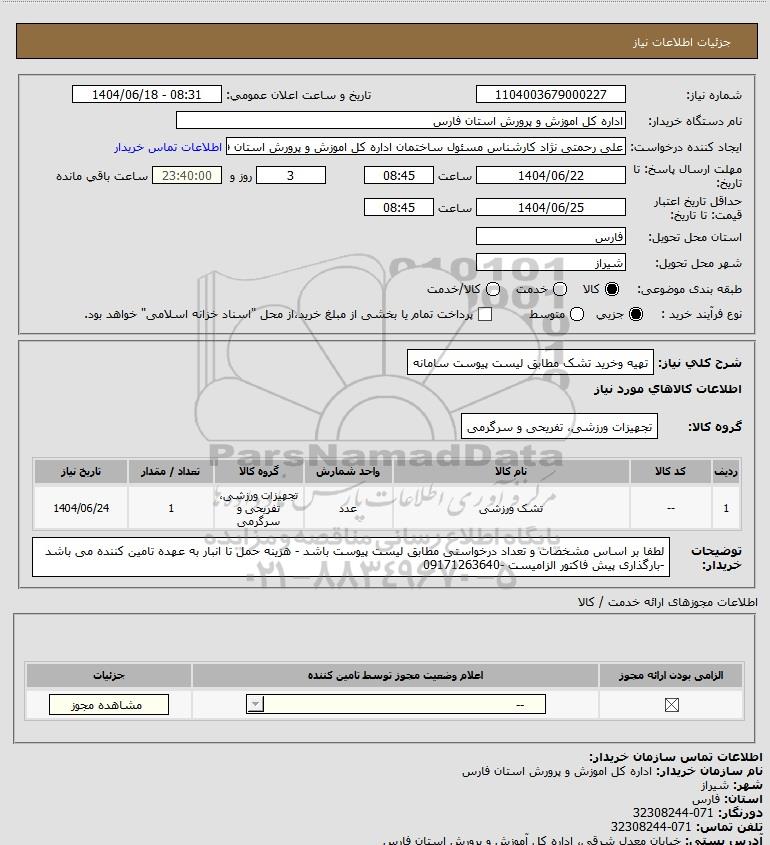 | 1 | -- | تشک ورزشی | عدد | تجهیزات ورزشی، تفریحی و سرگرمی | 1 | 1404/06/24 |