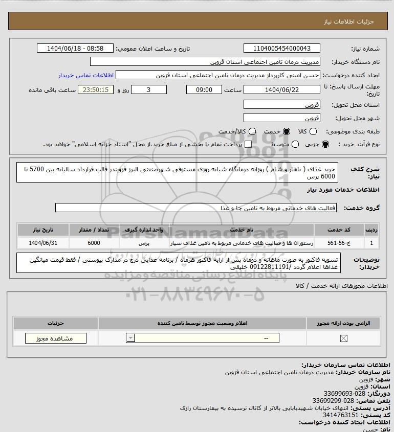 شرح کلی نیاز: خرید غذای ( ناهار و شام ) روزانه درمانگاه شبانه روزی مستوفی شهرصنعتی البرز قزویندر قالب قرارداد سالیانه بین 5700 تا 6000 پرس