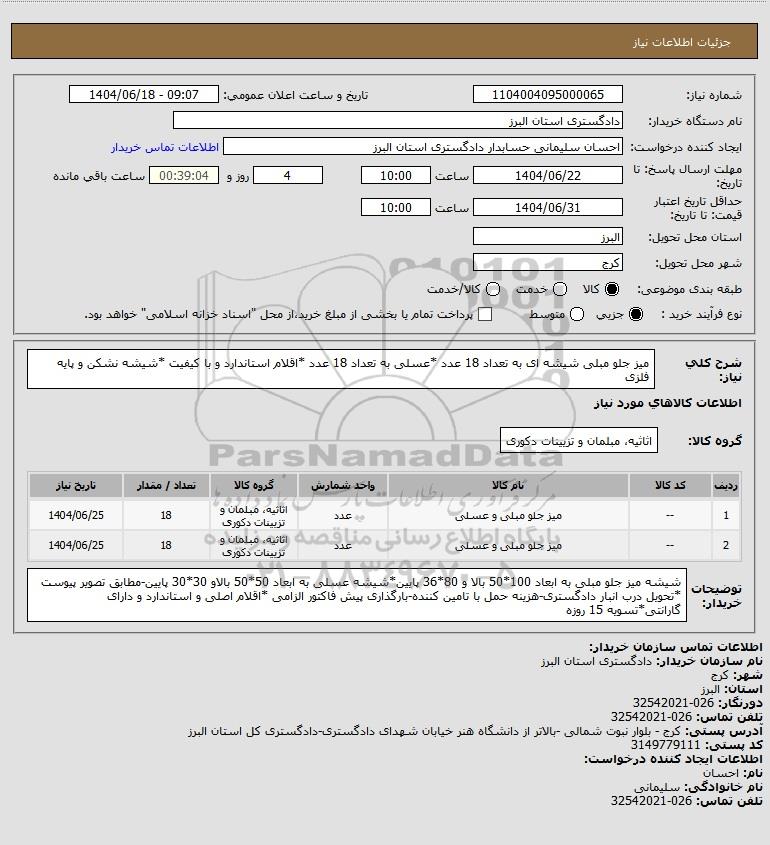 استعلام بها و موضوع استعلام استعلام میز جلو مبلی شیشه ای به تعداد 18 عدد *عسلی به تعداد 18 عدد *اقلام استاندارد و با کیفیت *شیشه نشکن و پایه فلزی به اطلاع کلیه شرکت‌ها و افراد متخصص واجد شرایط می‌رساند، آگهی گذار در نظر دارد از طریق استعلام بها، نسبت به انتخاب و دریافت پیشنهادات اقدام نماید. این استعلام با کد آگهی ثبت شده در سامانه خبرگزاری پارس نماد : 9524006 منتشر شده است. مشخصات استعلام : تاریخ شروع استعلام: 1404/06/18 آخرین مهلت ارسال پیشنهاد قیمت : 1404/06/22 و محل اجرای پروژه : استان البرز میباشد. استعلام قیمت مورد درخواست : استعلام میز جلو مبلی شیشه ای به تعداد 18 عدد *عسلی به تعداد 18 عدد *اقلام استاندارد و با کیفیت *شیشه نشکن و پایه فلزی با دسته‌بندی‌های تخصصی و گروه های مرتبط : صنایع شیشه, مصنوعات چوبی و مبلمان اداری, استعلام اطلاع رسانی میگردد. شرایط شرکت در استعلام آنلاین : ابتدا ثبت نام در سامانه استعلام پارس نماد و تکمیل مدارک موردنیاز و بارگذاری در سامانه رعایت تمامی ضوابط و الزامات مندرج در اسناد استعلام است.
