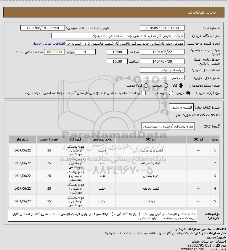 نام دستگاه خریدار:شرکت پالایش گاز شهید هاشمی نژاد استان خراسان رضوی