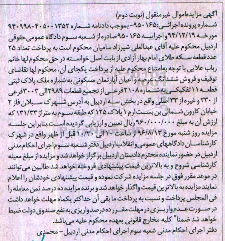 مزایده آپارتمان مسکونی قطعه 11 تفکیکی کلاسه 950165