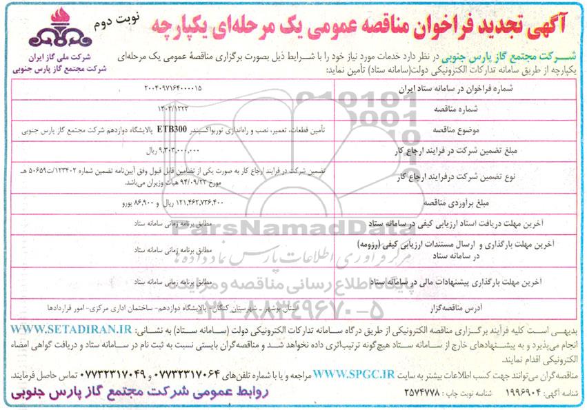 موضوع مناقصه: تامین قطعات، تعمیر، نصب و راه اندازی توربواکسپندر ETB300 پالایشگاه دوازدهم شرکت مجتمع گاز پارس جنوبی