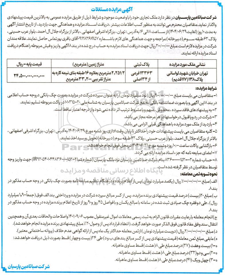 شرکت صبا تامین پارسیان در نظر دارد ملک تجاری خود را با وضعیت موجود و شرایط ذیل از طریق مزایده عمومی به بالاترین قیمت پیشنهادی واگذار نماید. متقاضیان محترم میتوانند به منظور کسب اطلاعات بیشتر دریافت اسناد مزایده و هماهنگی جهت بازدید از تاریخ انتشار آگهی به مدت 10 روز لغایت 1404.06.29) از ساعت 8 الی 16 به آدرس: تهران، بزرگراه اشرفی اصفهانی ، بالاتر از بزرگراه جلال آل احمد، بلوار عرب حسینی پلاک 62 طبقه سوم (دبیرخانه) مراجعه و جهت هماهنگی های لازم با شماره 09128268957 آقای باقری پورتماس حاصل نمایند. علاقه مندان شرکت در مزایده لازم است مبلغ 200.000.000 ریال جهت دریافت اسناد مزایده به حساب درج شده در بند 8 آگهی واریز و فیش مربوطه را هنگام دریافت اسناد مزایده ارائه نمایند.
