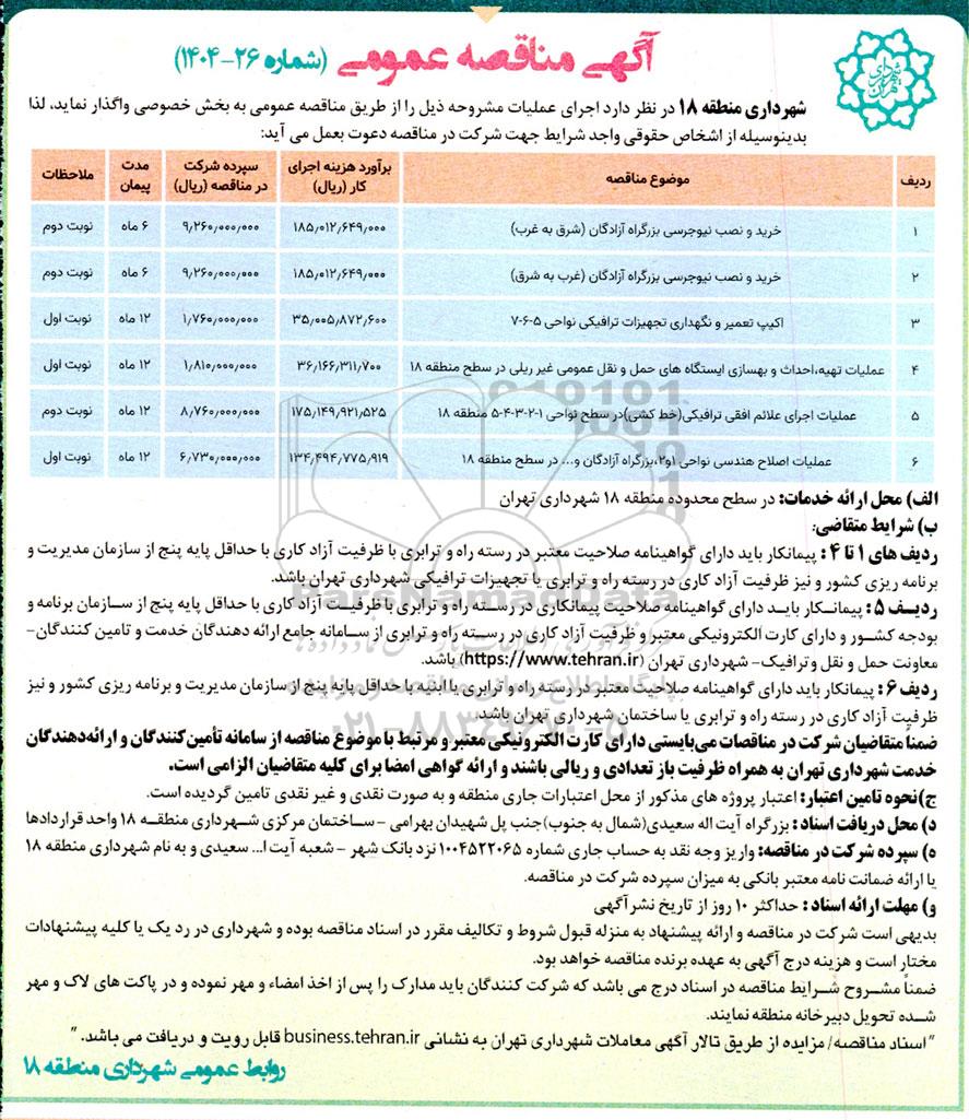 | 6 | عملیات اصلاح هندسی نواحی 1 و 2 بزرگراه آزادگان و... در سطح منطقه 18 | 134.494.775.919 | 6.730.000.000 | 12 ماه | نوبت اول |