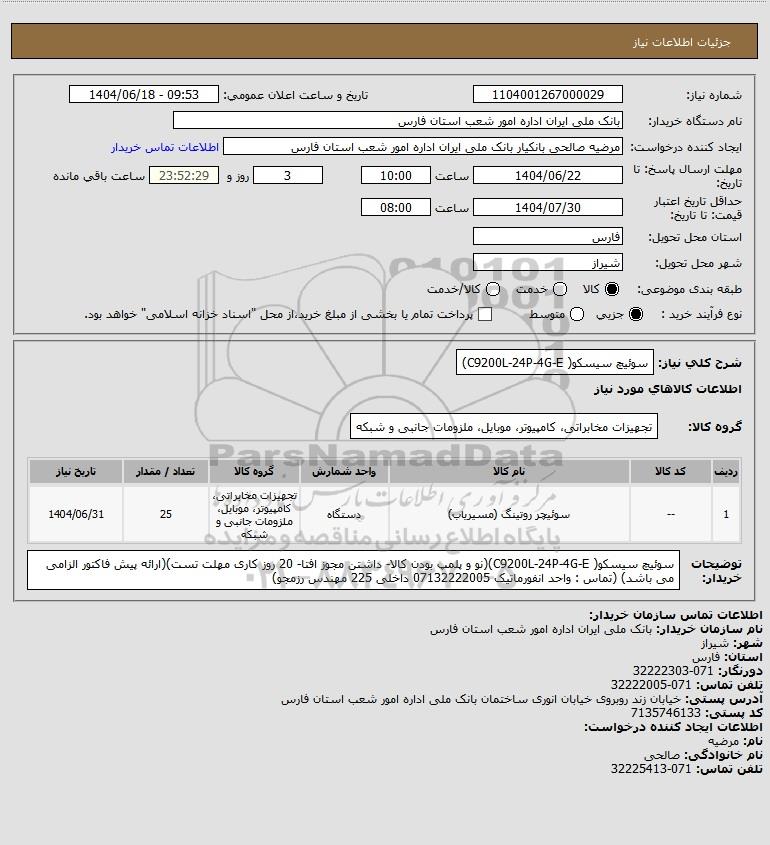 | 1 | -- | سوئیچر روتینگ (مسیریاب) | دستگاه | تجهیزات مخابراتی، کامپیوتر، موبایل، ملزومات جانبی و شبکه | 25 | 1404/06/31 |