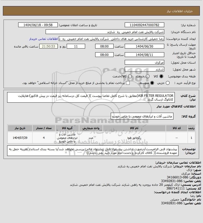 شرح کلی نیاز: AIR FILTER REGULATOR(مطابق با شرح کامل تقاضا پیوست )( قیمت کل درسامانه ریز قیمت در پیش فاکتور)-هایلایت کاتالوگ ارسال گردد