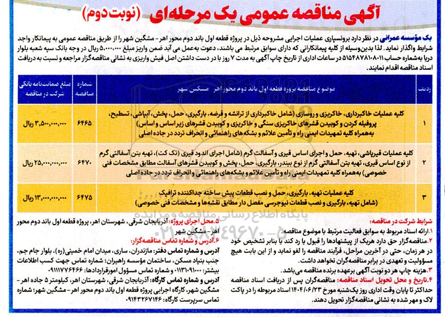 یک موسسه عمرانی در نظر دارد برونسپاری عملیات اجرایی مشروحه ذیل در پروژه قطعه اول باند دوم محور اهر - مشگین شهر را از طریق مناقصه عمومی به پیمانکار واجد شرایط واگذار نماید. لذا بدین وسیله از کلیه پیمانکارانی که دارای سوابق مرتبط میباشند، دعوت به عمل می آید ضمن واریز مبلغ 5.000.000 ریال در وجه بانک سپه شعبه بلوار دریا به شماره حساب 5154878108011 در ساعات اداری از تاریخ چاپ آگهی به مدت 7 روز با در دست داشتن اصل فیش واریزی به نشانی مناقصه گزار مراجعه و نسبت به دریافت اسناد مناقصه اقدام نمایند.