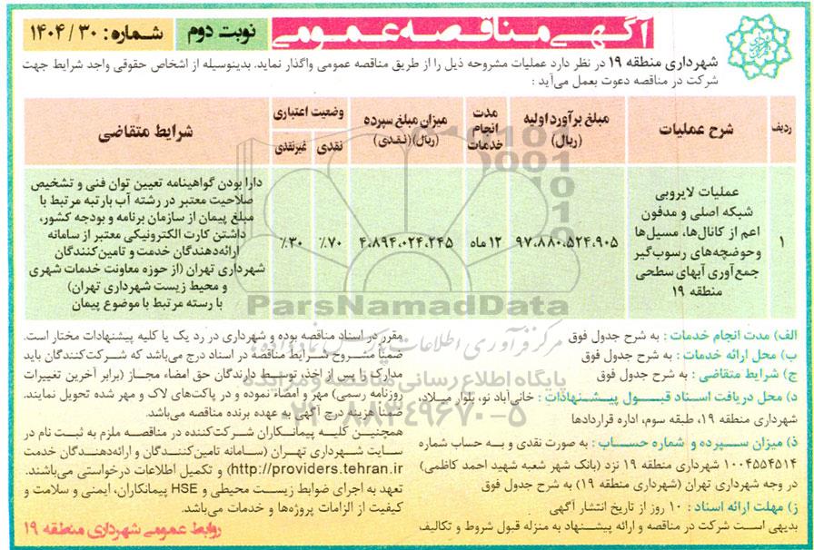 شهرداری منطقه 19 تهران در نظر دارد عملیات مشروحه ذیل را از طریق مناقصه عمومی واگذار نماید، بدینوسیله از اشخاص حقوقی واجد شرایط جهت شرکت در مناقصه ذیل دعوت به عمل می آید: