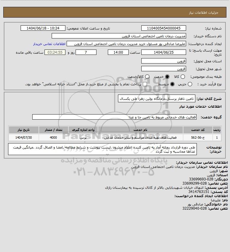 شرح کلی نیاز: تامین ناهار پرسنل درمانگاه بوئین زهرا طی یکسال