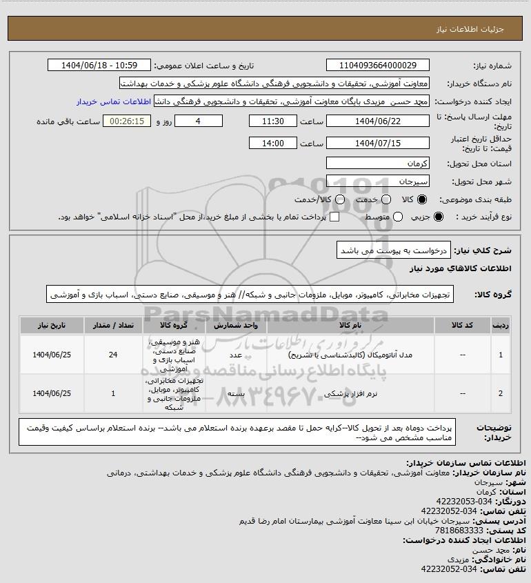 نام دستگاه خریدار:معاونت آموزشی، تحقیقات و دانشجویی فرهنگی دانشگاه علوم پزشکی و خدمات بهداشتی، درمانی سیرجان
