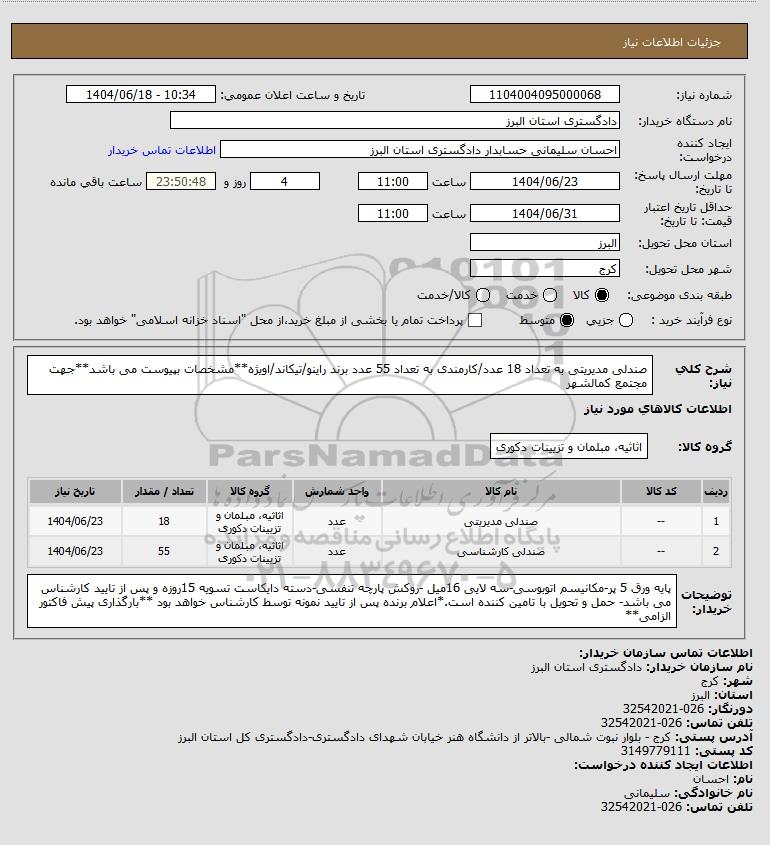 استعلام بها و موضوع استعلام استعلام صندلی مدیریتی به تعداد 18 عدد/کارمندی به تعداد 55 عدد برند راینو/تیکاند/اویژه**مشخصات بپیوست می باشد**جهت مجتمع کمالشهر به اطلاع کلیه شرکت‌ها و افراد متخصص واجد شرایط می‌رساند، آگهی گذار در نظر دارد از طریق استعلام بها، نسبت به انتخاب و دریافت پیشنهادات اقدام نماید. این استعلام با کد آگهی ثبت شده در سامانه خبرگزاری پارس نماد : 9525336 منتشر شده است. مشخصات استعلام : تاریخ شروع استعلام: 1404/06/18 آخرین مهلت ارسال پیشنهاد قیمت : 1404/06/23 و محل اجرای پروژه : استان البرز میباشد. استعلام قیمت مورد درخواست : استعلام صندلی مدیریتی به تعداد 18 عدد/کارمندی به تعداد 55 عدد برند راینو/تیکاند/اویژه**مشخصات بپیوست می باشد**جهت مجتمع کمالشهر با دسته‌بندی‌های تخصصی و گروه های مرتبط : مصنوعات چوبی و مبلمان اداری, استعلام اطلاع رسانی میگردد. شرایط شرکت در استعلام آنلاین : ابتدا ثبت نام در سامانه استعلام پارس نماد و تکمیل مدارک موردنیاز و بارگذاری در سامانه رعایت تمامی ضوابط و الزامات مندرج در اسناد استعلام است.