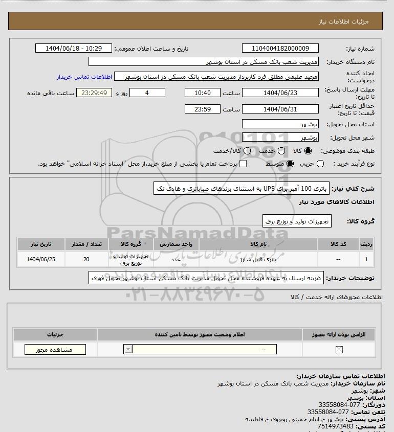 | 1 | -- | باتری قابل شارژ | عدد | تجهیزات تولید و توزیع برق | 20 | 1404/06/25 |