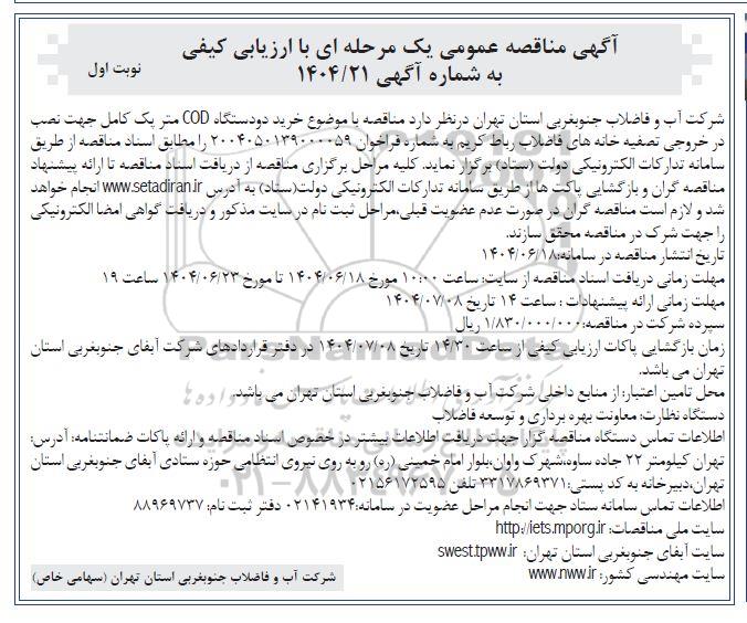 شرکت آب و فاضلاب جنوبغربی استان تهران در نظر دارد مناقصه با موضوع خرید دو دستگاه COD متر یک کامل جهت نصب در خروجی تصفیه خانه های فاضلاب رباط کریم به شماره فراخوان 2004050139000059 را مطابق اسناد مناقصه از طریق سامانه تدارکات الکترونیکی دولت ستاد برگزار نماید کلیه مراحل برگزاری مناقصه از دریافت اسناد مناقصه تا ارائه پیشنهاد مناقصه گران و بازگشایی پاکتها از طریق سامانه تدارکات الکترونیکی دولت (ستاد) به آدرس سایت ستاد ایران انجام خواهد شد و لازم است مناقصه گران در صورت عدم عضویت قبلی مراحل ثبت نام در سایت مذکور و دریافت گواهی امضا الکترونیکی