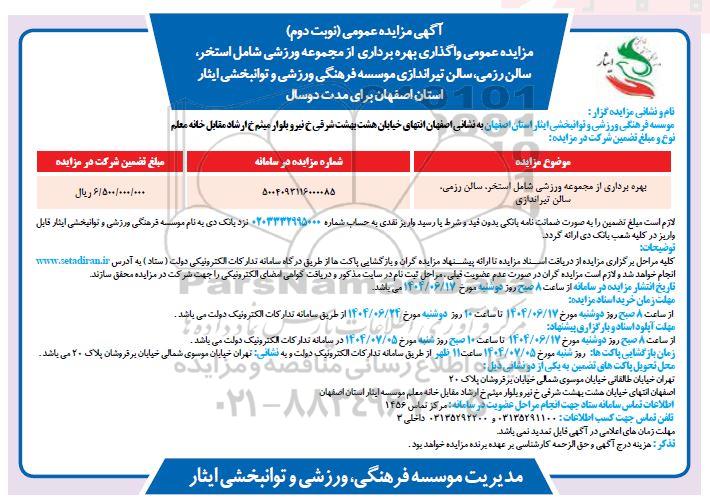 مزایده عمومی مزایده عمومی واگذاری بهره برداری از مجموعه ورزشی شامل استخر ،سالن رزمی- نوبت دوم برگزار میگردد. از کلیه افراد متخصص و شرکت‌های واجد شرایط دعوت به عمل می‌آید تا در این مزایده با کد خبرگزاری پارس نماد : 9525679 شرکت نمایند تاریخ شروع مزایده : 1404/06/18 مهلت شرکت در مزایده: تا پایان روز 1404/06/28 مکان برگزاری اموال واگذاری استان‌های اصفهان و دسته‌بندی‌های مربوط به این حراجی واگذاری ورزشگاه، پارکینگ، غرفه و بوفه میباشد. اطلاعات دقیق‌تر درباره شرایط شرکت در مزایده آنلاین و نحوه ارسال مدارک، الزامات پروژه و دریافت اسناد مزایده و تاریخ بازگشایی پاکت‌ها، در بخش اطلاعات تکمیلی این آگهی درج شده است.
