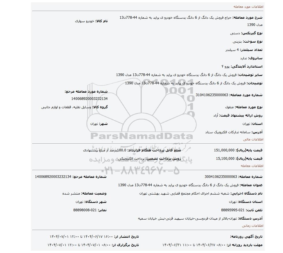| عنوان معامله: فروش یک دانگ از 6 دانگ یدستگاه خودرو ی پراید به شماره 44-778ن13 مدل 1390 | ||