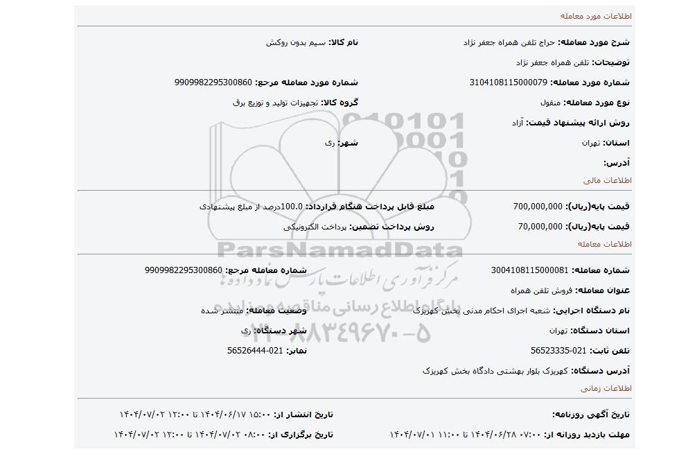 | شماره مورد معامله: 3104108115000079 | شماره مورد معامله مرجع: 9909982295300860 | |