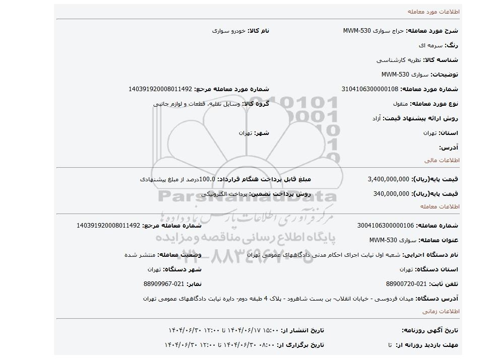 | شرح مورد معامله: حراج سواری MWM-530 | نام کالا: خودرو سواری | |