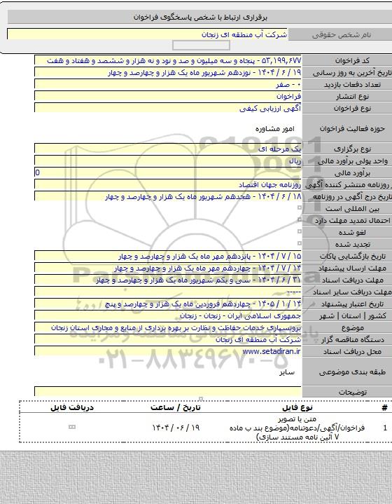 مناقصه برونسپاری خدمات حفاظت و نظارت بر بهره برداری از منابع و مجاری استان زنجان از کلیه افراد متخصص و شرکتها واجد شرایط دعوت به عمل میآید در مناقصه با کد خبرگزاری پارس نماد: 9525725 شرکت نمایند.