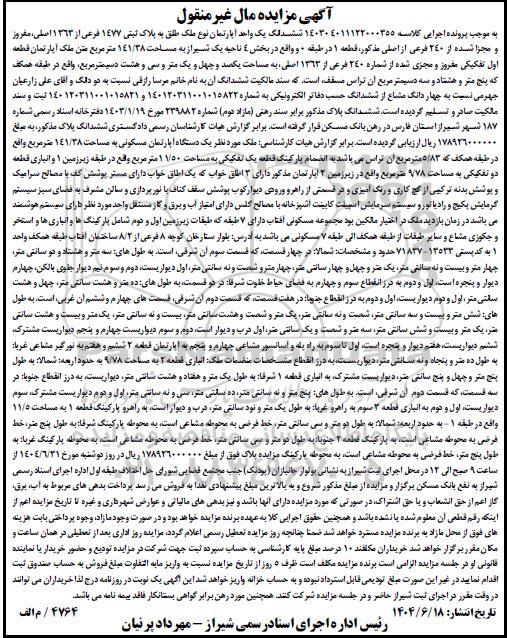 موضوع: مزایده ششدانگ یک واحد آپارتمان نوع ملک طلق به پلاک ثبتی 1477 فرعی از 1363 اصلی، مفروز و مجزا شده از 240 فرعی از اصلی مذکور به مبلغ 178926000000 ریال