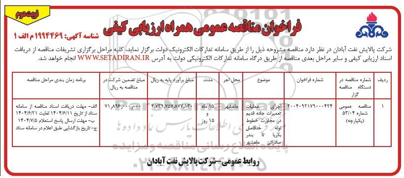 1 مناقصه عمومی شماره 53.04 2004092179000424  اجرای عملیات تعمیرات جاده قدیم در مجاور خطوط لوله حدفاصل بکریا تا بندر صادراتی ماهشهر ماهشهر 15 ماه و 15 روز 2.739.757.877.130 71.896.000.000 الف- مهلت دریافت اسناد ارزیابی کیفی از سامانه ستاد از تاریخ 1404.6.11 لغایت 1404.6.21