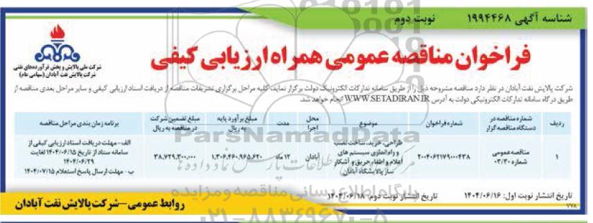 | 1 | مناقصه عمومی شماره 03/30 | 2004062179000438 | طراحی، خرید، ساخت نصب و راه اندازی سیستم های اعلام و اطفاء حریق و آشکار ساز پالایشگاه آبادان | آبادان | 12 ماه | 1.306.460.965.620 | 38.729.300.000 | الف- مهلت دریافت اسناد ارزیابی کیفی از سامانه ستاد از تاریخ 1404.6.15 لغایت 1404.6.29 ب- مهلت ارسال پاسخ استعلام 1404.07.15 |
