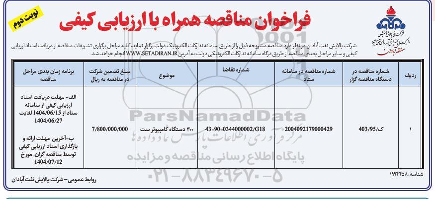 فراخوان مناقصه 300 دستگاه کامپیوتر ست نوبت دوم از کلیه افراد متخصص و شرکتها واجد شرایط دعوت به عمل میآید در مناقصه با کد خبرگزاری پارس نماد: 9526087 شرکت نمایند.