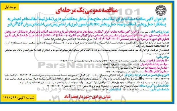 شهرداری نجف آباد در نظر دارد فراخوان آگهی مناقصه  عمليات اجرای آسفالت در سطح معابر مناطق پنجگانه شهرداری شامل تهیه آسفالت با قیر تحویلی به پیمانکار، حمل و پخش آسفالت و تهیه ، حمل و پخش mc یا امولسیون قیری بر اساس پیش بینی اختصاص میزان 253 تن قیر خالص ( 70-60 با 6416-PG) شرکت عایق اصفهان از طرف سازمان شهرداری و دهياری های کشور به این شهرداری به شماره سیستمي 20040902860000031   را از طریق سامانه تداركات الكترونيكي دولت برگزار نماید.