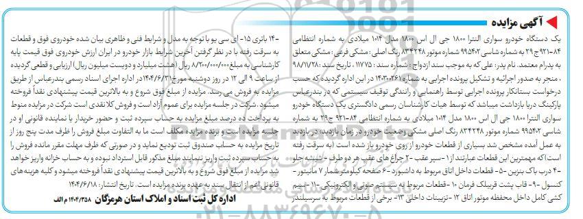 مزایده فروش یک دستگاه خودرو سواری النترا 1800 جی ال اس 1800 مدل 1014 میلادی