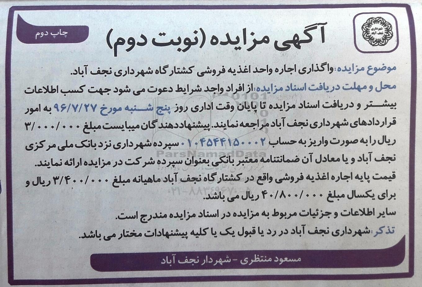 موضوع مزایده : واگذاری اجاره واحد اغذیه فروشی کشتارگاه شهرداری نجف آباد