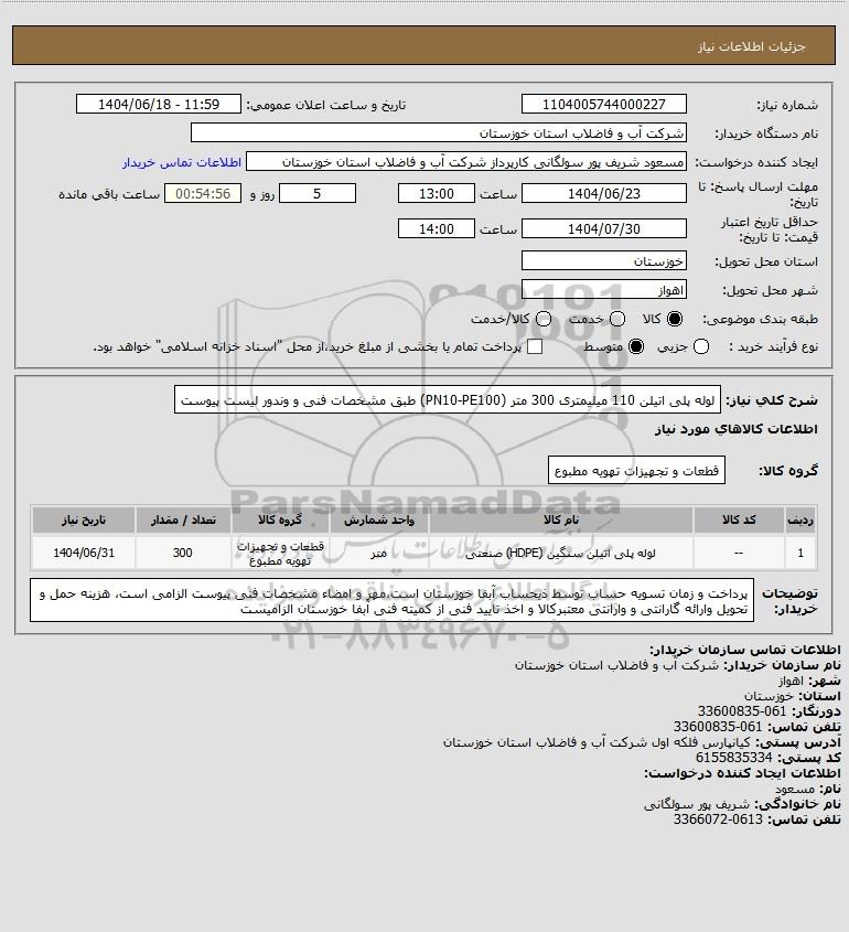 شرح کلی نیاز: لوله پلی اتیلن 110 میلیمتری 300 متر (PN10-PE100) طبق مشخصات فنی و وندور لیست پیوست