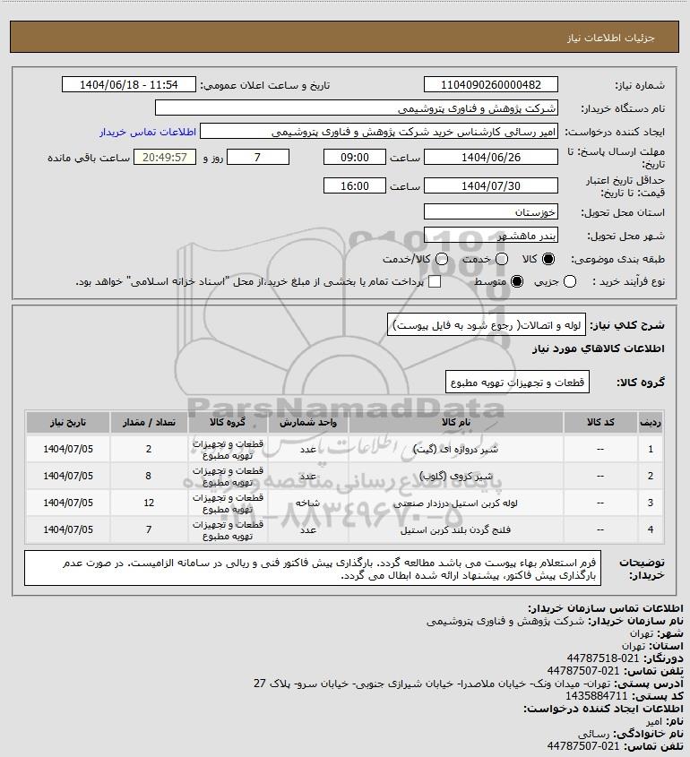 شرح کلی نیاز: لوله و اتصالات( رجوع شود به فایل پیوست)