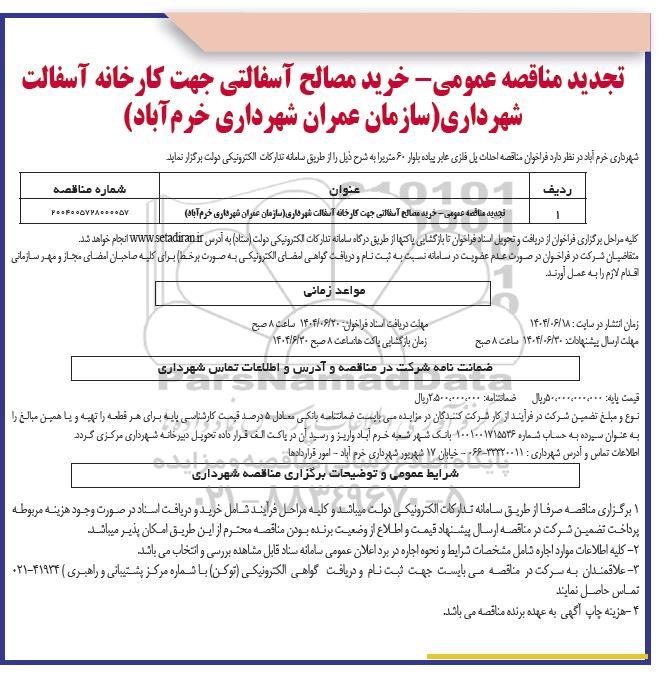 | 1 | تجدید مناقصه عمومی - خرید مصالح آسفالتی جهت کارخانه آسفالت شهرداری سازمان عمران شهرداری خرم آباد | 2004005728000057 |