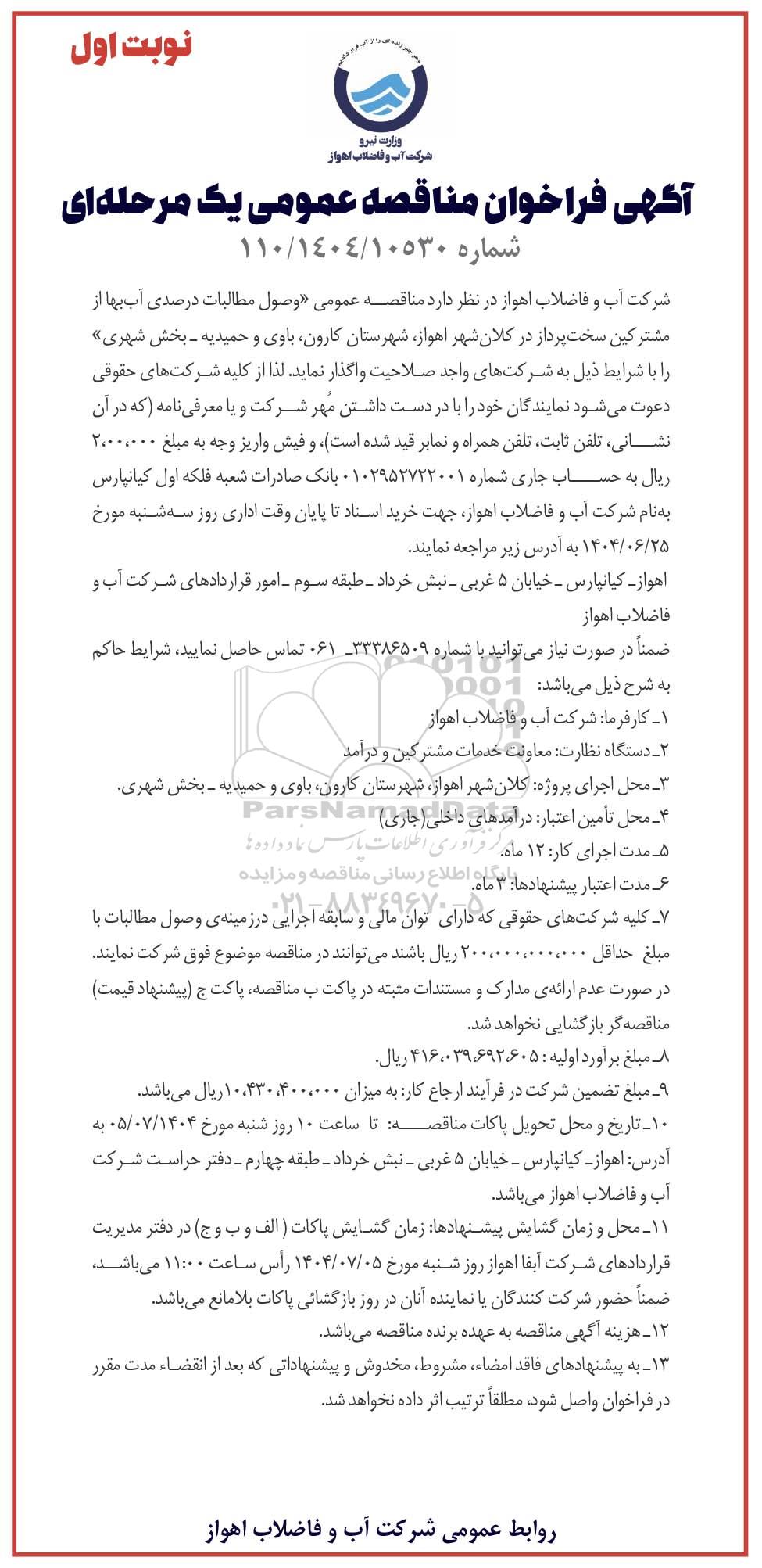 شرکت آب و فاضلاب اهواز در نظر دارد مناقصه عمومی وصول مطالبات درصدی آب بها از مشترکین سخت پرداز در کلان شهر اهواز، شهرستان کارون، باوی و حمیدیه - بخش شهری را با شرایط ذیل به شرکتهای واجد صلاحیت واگذار نماید لذا از کلیه شرکتهای حقوقی دعوت میشود نمایندگان خود را با در دست داشتن مهر شرکت و یا معرفی نامه که در آن نشانی تلفن ثابت تلفن همراه و نمابر قید شده است و فیش واریز وجه به مبلغ 2.000.000 ریال به حساب جاری شماره 0102952722001 بانک صادرات شعبه فلکه اول کیانپارس به نام شرکت آب و فاضلاب اهواز جهت خرید اسناد تا پایان وقت اداری روز سه شنبه مورخ 1404.06.25 به آدرس زیر مراجعه نمایند.