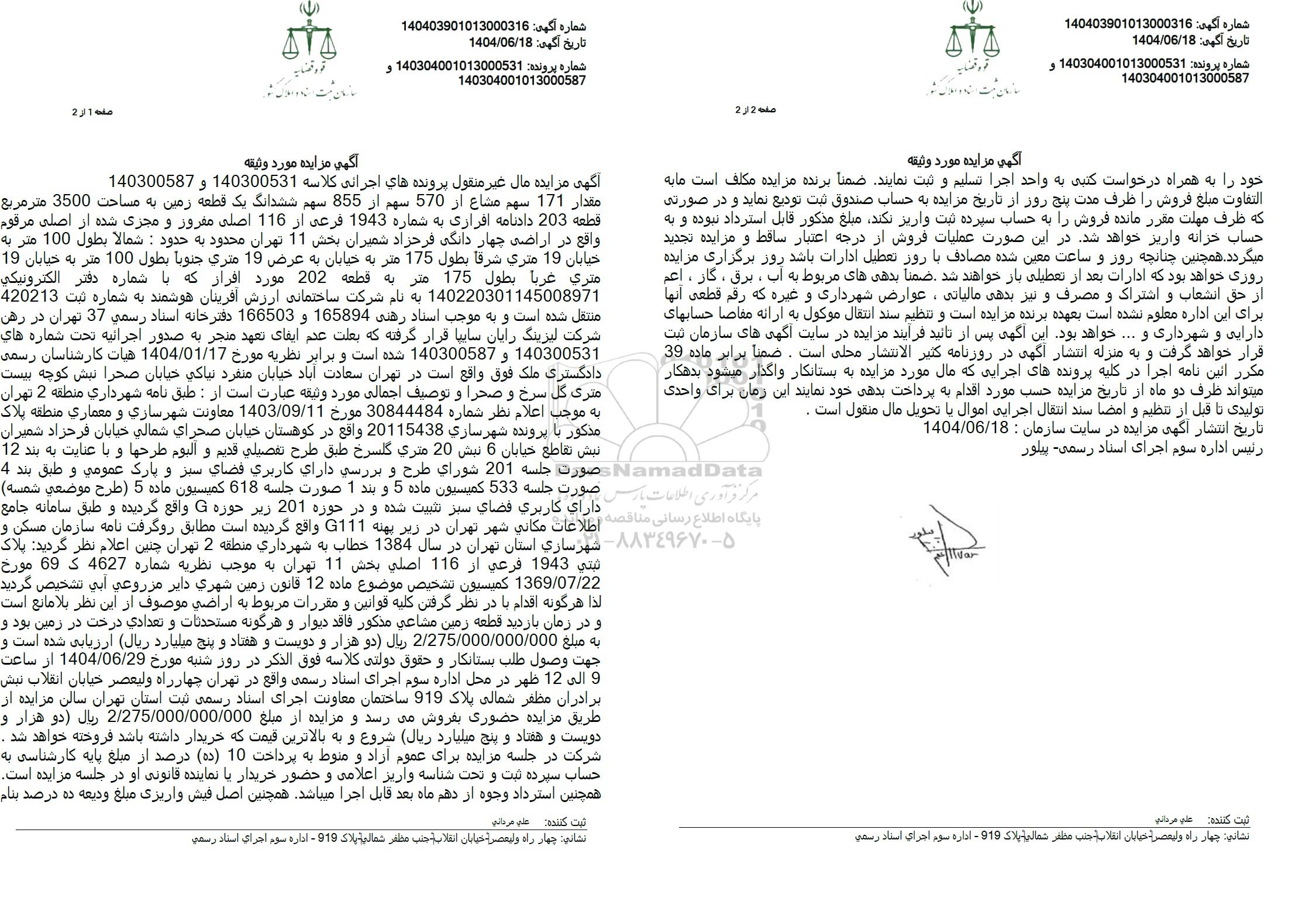 مزایده فروش یک قطعه زمین به مساحت 3500 مترمربع به پلاک ثبتی 1943 فرعی از 116 اصلی