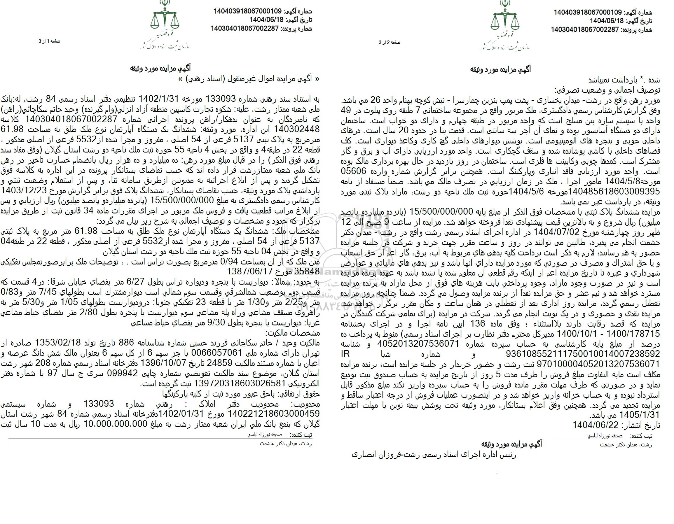مزایده فروش یک دستگاه آپارتمان به مساحت 61.98 مترمربع به پلاک ثبتی 5137 فرعی از 54 اصلی