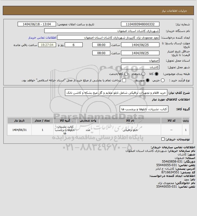شرح کلی نیاز: خرید اقلام و تجهیزات ترافیکی شامل تابلو علایم و گل میخ بشکه و کاشن تانک