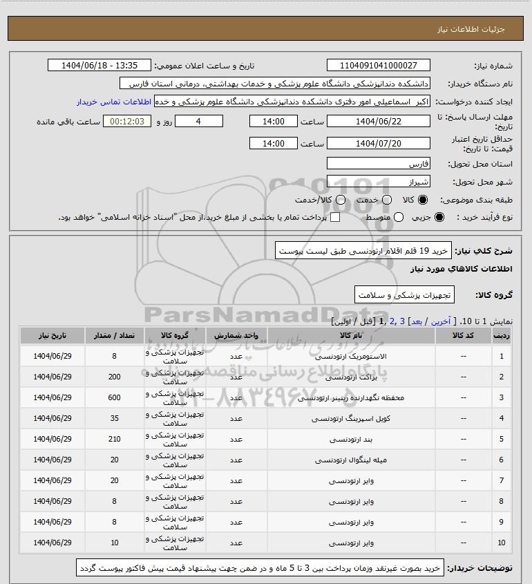 شرح کلی نیاز: خرید 19 قلم اقلام ارتودنسی طبق لیست پیوست