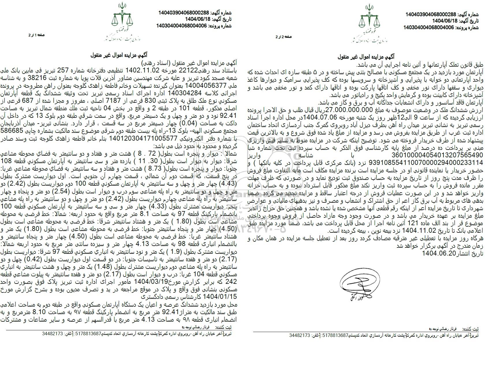 مزایده ششدانگ یک قطعه آپارتمان مسکونی پلاک ثبتی 830 فرعی کلاسه 140304284