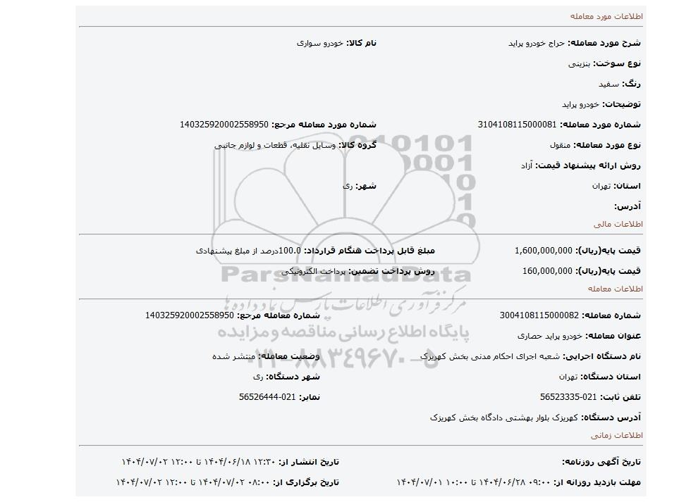 | شماره مورد معامله: 3104108115000081 | شماره مورد معامله مرجع: 140325920002558950 | |