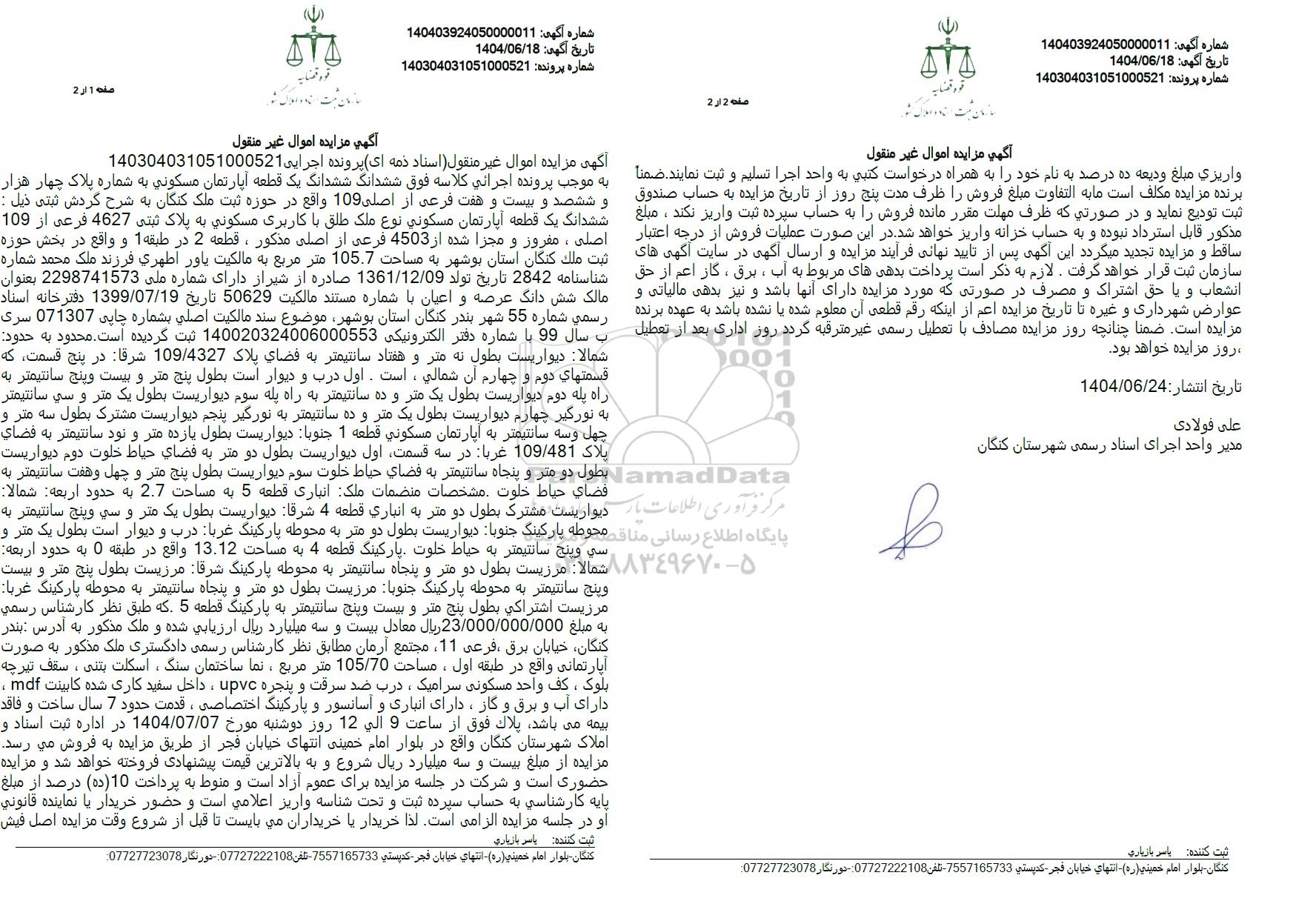 مزایده فروش یک قطعه آپارتمان مسکونی به شماره پلاک 4627 فرعی از 109 اصلی به مساحت 105.7 مترمربع