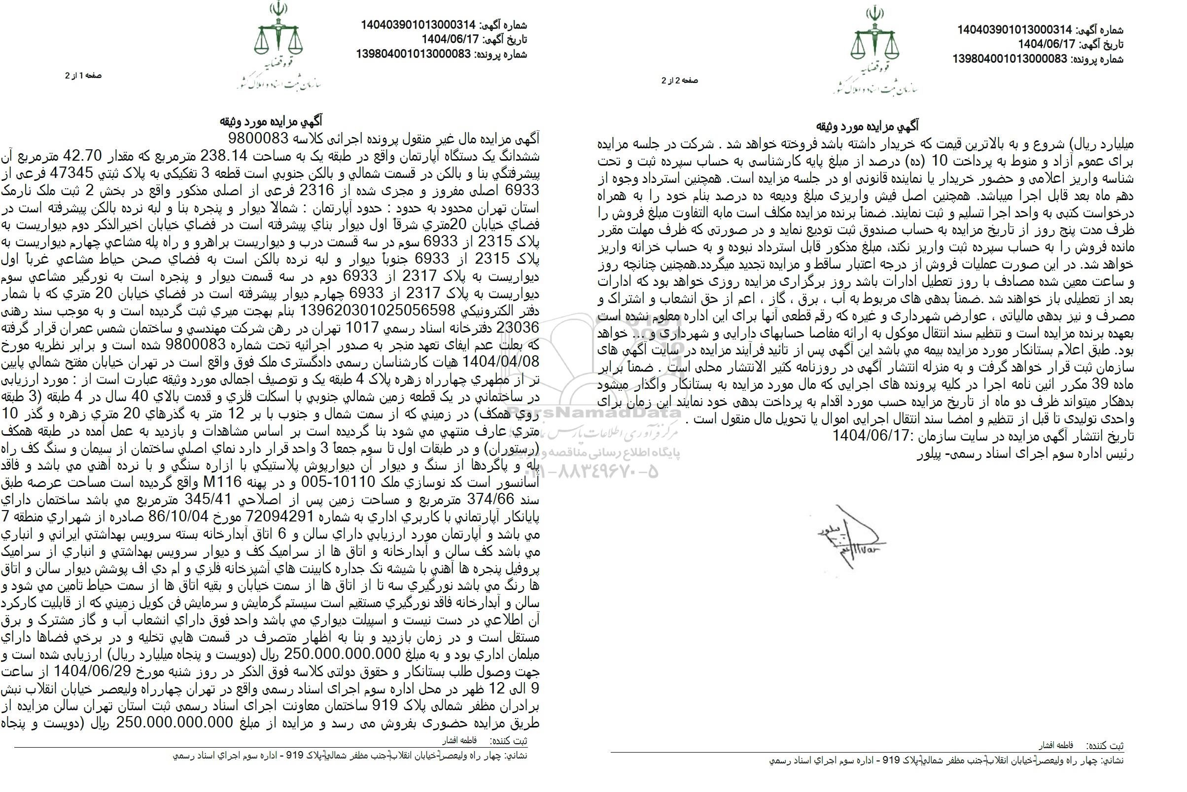 مزایده ششدانگ یک دستگاه آپارتمان به مساحت 238.14 مترمربع , مزایده ششدانگ یک دستگاه آپارتمان به مساحت 238.14 مترمربع